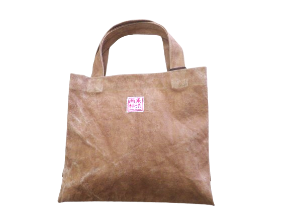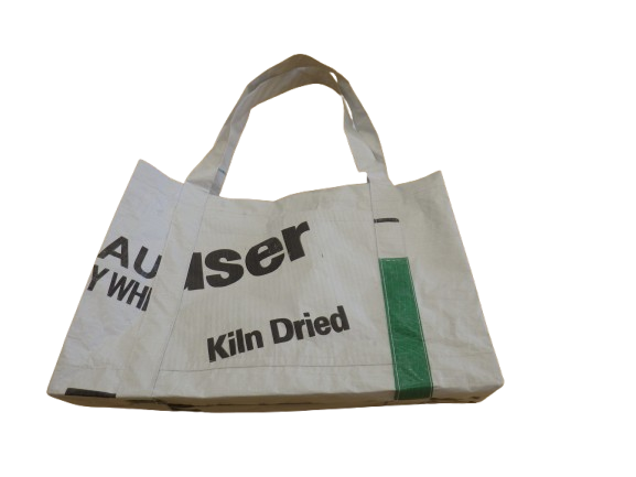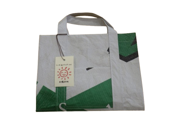 株式会社プレックコンポーネント様からのご提案により、木材を輸入する時に木材にかける防汚シートを活用して作ったバッグです。